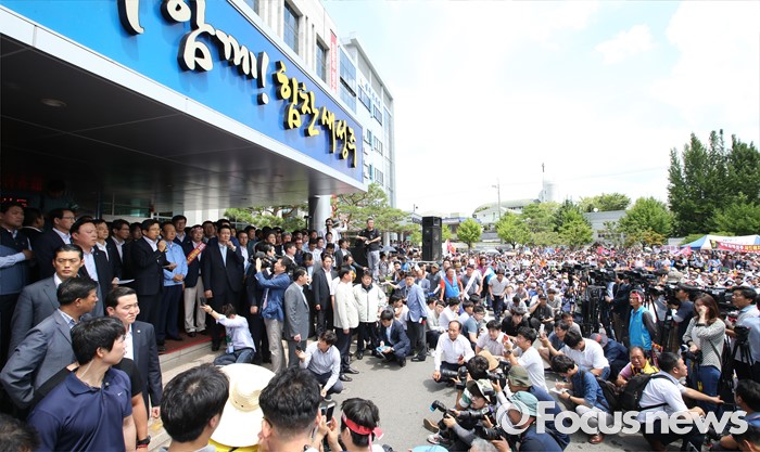 (성주=포커스뉴스) 황교안 국무총리와 한민구 국방부장관이 15일 오전 경북 성주군청광장에서 사드(THAAD, 고고도미사일방어체계) 배치에 대한 주민설명회에서 주민들에게 설명을 하고 있다.