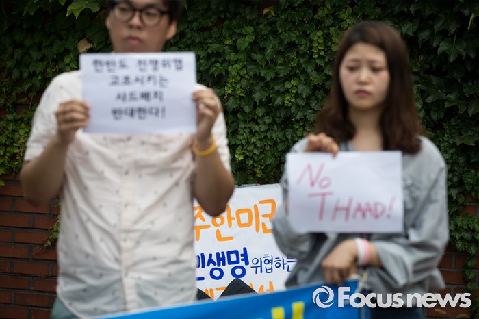 (서울=포커스뉴스) 좋은 대한민국 만들기 대학생 운동본부' 소속 학생들이 15일 오전 서울 용산 미군 기지 앞에서 '사드 배치 반대 48시간 대학생 긴급농성 선포' 기자회견을 열고 있다. 이날 대학생들은 기자회견을 마친 후 용산 미군 기지 2번 게이트 앞에서 48시간 농성에 들어갔다.