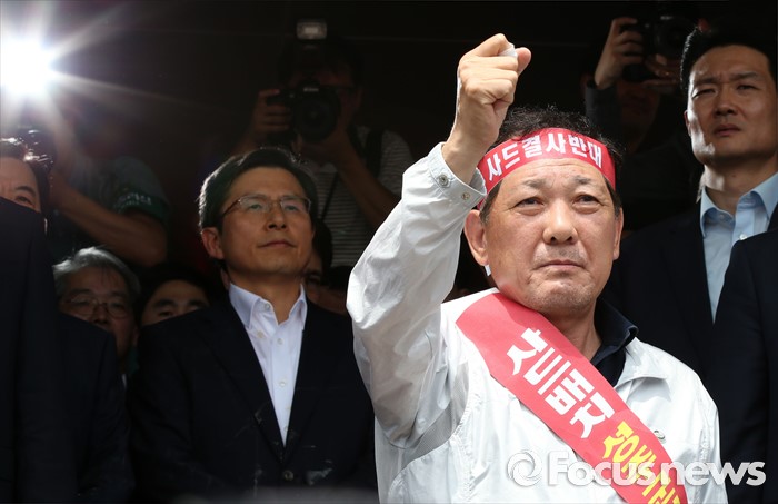 (성주=포커스뉴스) 황교안 국무총리와 한민구 국방부장관이 15일 오전 경북 성주군청광장에서 사드(THAAD, 고고도미사일방어체계) 배치에 대한 주민설명회를 가진 가운데 김항곤 성주군수가 사드배치 반대 의사를 밝히고 있다.