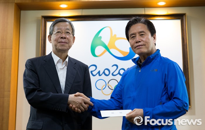 (서울=포커스뉴스) 15일 오전 서울 노원구 태릉선수촌에서 리우올림픽에 출전하는 선수들을 격려하기 위해 방문한 김희옥(왼쪽) 새누리당 혁신비상대책위원장이 최종삼 태릉선수촌장에게 격려금을 전달하고 있다.