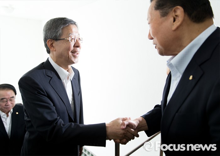 (서울=포커스뉴스) 15일 오전 서울 노원구 태릉선수촌에서 리우올림픽에 출전하는 선수들을 격려하기 위해 방문한 김희옥(왼쪽) 새누리당 혁신비상대책위원장이 김정행 대한체육회 회장과 인사를 나누고 있다.