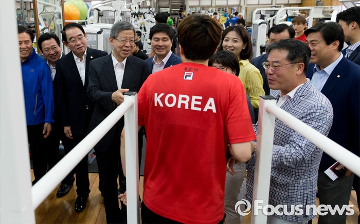 (서울=포커스뉴스) 김희옥 새누리당 혁신비상대책위원장이 15일 오전 서울 노원구 태릉선수촌을 방문해 리우올림픽에 출전하는 선수들을 격려하고 있다.