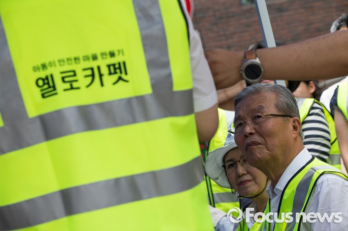 (서울=포커스뉴스) 김종인(오른쪽) 더불어민주당 비상대책위원회 대표가 15일 오전 서울 성북구 안암초등학교 앞에서 열린 아동안전 프로젝트 '옐로 카펫' 제작행사에 참여해 관계자들에게 설명을 듣고 있다.