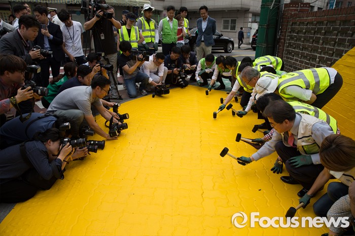 | △ 어린이 안전 위해 어른들이 옐로 카펫 설치 |
