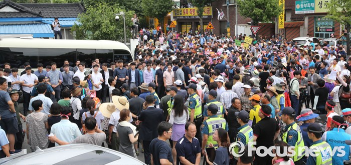 (성주=포커스뉴스) 황교안 국무총리와 한민구 국방부장관이 15일 오전 경북 성주군청광장에서 사드(THAAD, 고고도미사일방어체계) 배치에 대한 주민설명회를 마치고 차량에 오르자 주민들이 항의하고 있다.