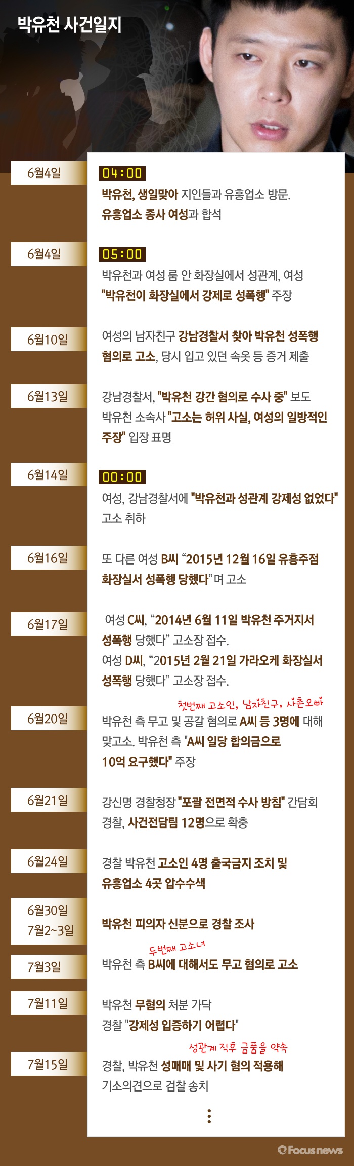 (서울=포커스뉴스) 서울 강남경찰서는 15일 박 씨에 대한 성폭행 피소 사건 4건은 강제성이 없는 성관계라고 보고 무혐의로 판단, 불기소 의견으로 검찰에 송치했다고 밝혔다. 그러나 고소여성 4명 중 1명과의 성관계를 성매매로 규정해 박 씨를 성매매와 사기 혐의로 기소의견으로 검찰에 송치했다. 해당 여성 역시 성매매 혐의로 검찰에 송치됐다.
