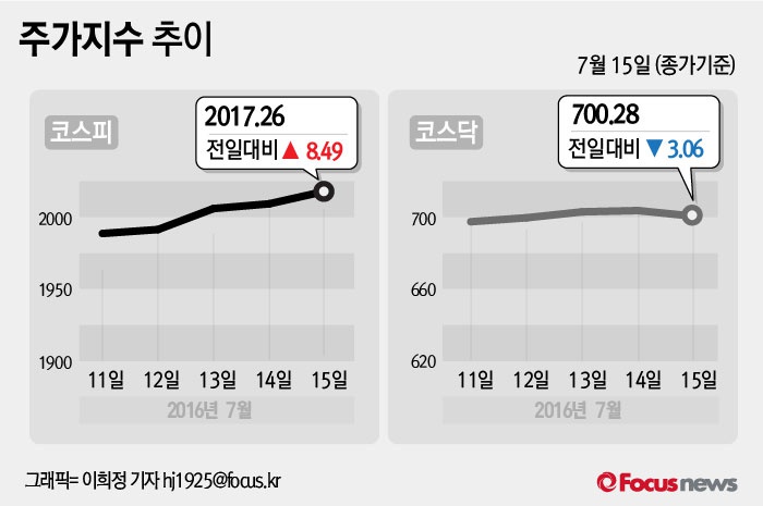 (서울=포커스뉴스) 15일 코스피지수는 전날보다 0.42%(8.49포인트) 오른 2017.26에 장을 마쳤다. 코스닥지수는 전일 대비 0.44%(3.06포인트) 내린 700.28에 마감했다.