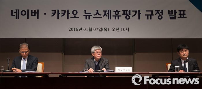 뉴스제휴평가위 허남진 위원장은 "제휴평가위 상반기 활동을 회고해보면 어뷰징이 많이 개선되고 매체가 자정노력을 하는 등 순기능이 있었으나, 기사로 위장된 광고 홍보, 선정적 기사 문제는 여전히 잔존하고 있어 모니터링을 더욱 강화해나갈 계획"이라며 "이와 함께 제휴와 제재 불균형 문제와 기제휴 매체사에 유리할 수 있는 구조를 조정하기 위해 제재 활동을 강화하고 재계약 평가 절차를 개선하는 안을 마련할 것"이라고 밝혔다.(서울=포커스뉴스) 인터넷 포털 네이버와 카카오의 뉴스 제휴 심사를 담당할 '뉴스제휴평가위원회'가 1월 7일 오전 서울 중구 프레스센터에서 '네이버-카카오 뉴스 제휴 및 제재 심사 규정'을 발표하는 기자간담회를 진행하고 있다. 배정근 제 1 소위원장, 허남진 위원장, 김병희 제 2 소위원장(왼쪽부터)이 세부 규정에 대해 발표하고 있다. 발표한 규정은 3월 1일부터 시행된다. 2016.01.07 김흥구 기자
