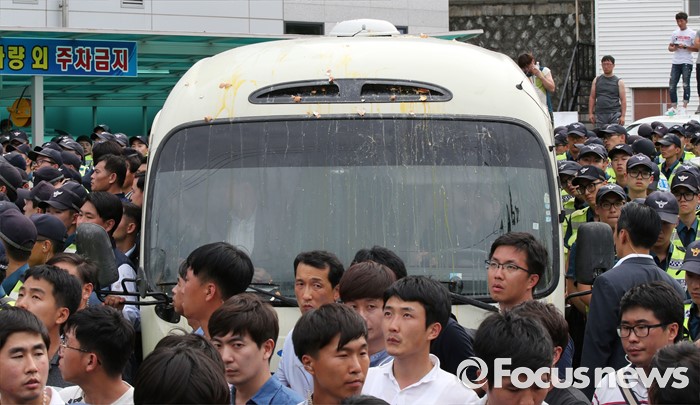 (성주=포커스뉴스) 황교안 국무총리와 한민구 국방부장관이 15일 경북 성주군청광장에서 사드(THAAD, 고고도미사일방어체계) 배치에 대한 주민설명회를 마치고 차량으로 이동하자 주민들이 황 총리가 탑승한 차량에 계란을 던져 계란자국이 보이고 있다.