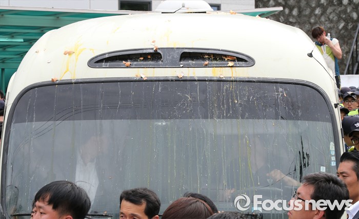 (성주=포커스뉴스) 황교안 국무총리와 한민구 국방부장관이 15일 경북 성주군청광장에서 사드(THAAD, 고고도미사일방어체계) 배치에 대한 주민설명회를 마치고 차량으로 이동하자 주민들이 황 총리가 탑승한 차량에 계란을 던져 계란자국이 보이고 있다.