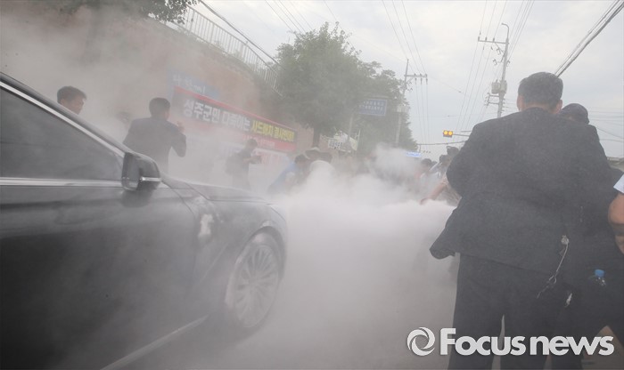 (성주=포커스뉴스) 황교안 국무총리와 한민구 국방부장관이 15일 경북 성주군청광장에서 사드(THAAD, 고고도미사일방어체계) 배치에 대한 주민설명회를 마치고 차량에 갖혀 6시간 넘게 대치중 버스에서 내려 승용차로 빠져나가려 하자 성주 주민들이 총리가 탑승한 차량을 막고 있다.