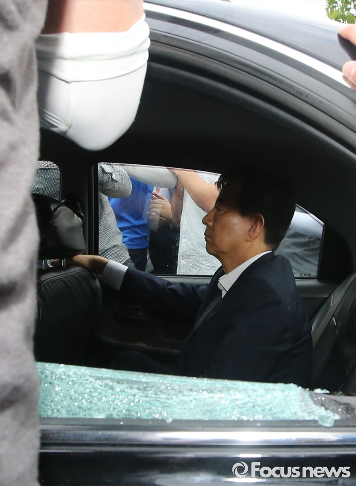 (성주=포커스뉴스) 황교안 국무총리와 한민구 국방부장관이 15일 경북 성주군청광장에서 사드(THAAD, 고고도미사일방어체계) 배치에 대한 주민설명회를 마치고 차량에 갖혀 6시간 넘게 대치, 승용차로 빠져나가려는 한구민 국방부장관의 차량유리가 깨져 있다.