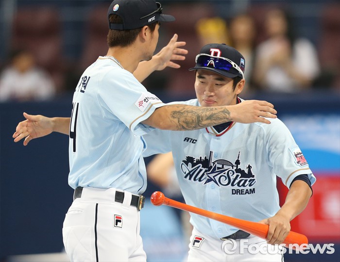 (서울=포커스뉴스) 16일 서울 고척 스카이돔에서 열린 2016 프로야구 올스타 경기에 앞서 가진 번트왕 대회에서 드림팀의 허경민이 공을 던져준 오재원과 포옹하고 있다.