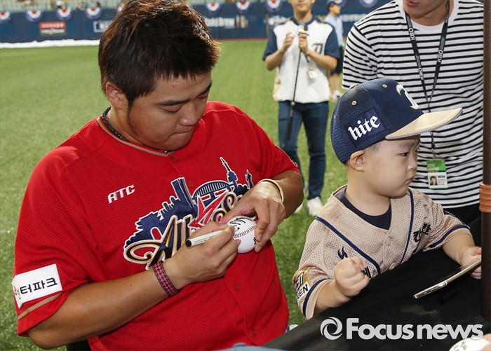 (서울=포커스뉴스) 16일 서울 고척 스카이돔에서 열린 2016 프로야구 올스타 경기에 앞서 가진 팬사인회에서 나눔팀의 박석민이 아들과 함께 참석해 팬에게 공에 사인을 해 주고 있다.