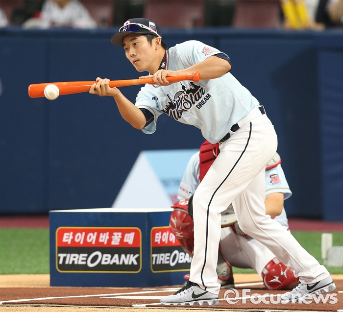 (서울=포커스뉴스) 16일 서울 고척 스카이돔에서 열린 2016 프로야구 올스타 경기에 앞서 가진 번트왕 대회에서 드림팀의 허경민이 번트를 대고 있다.