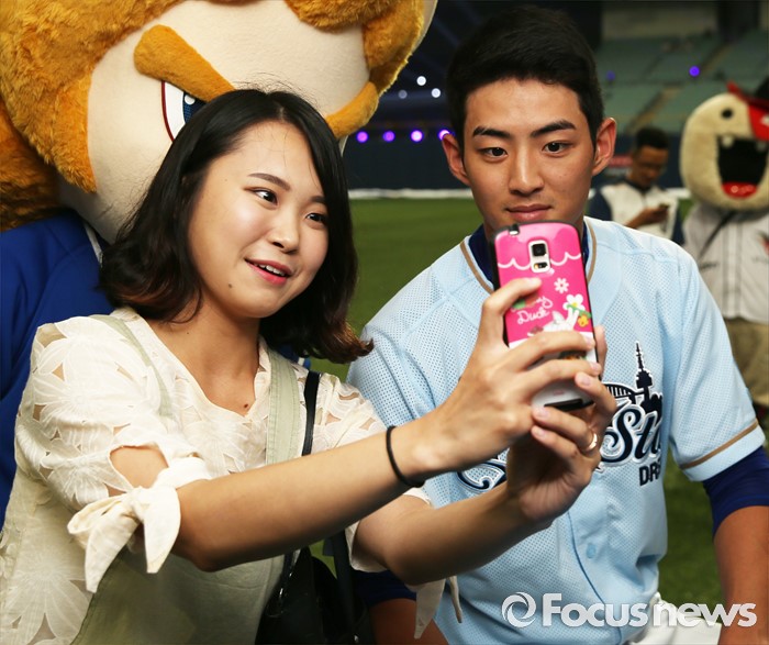 (서울=포커스뉴스) 16일 서울 고척 스카이돔에서 열린 2016 프로야구 올스타 경기에 앞서 가진 팬사인회에서 한 여성팬이 드림팀의 구자욱과 사진을 찍고 있다.