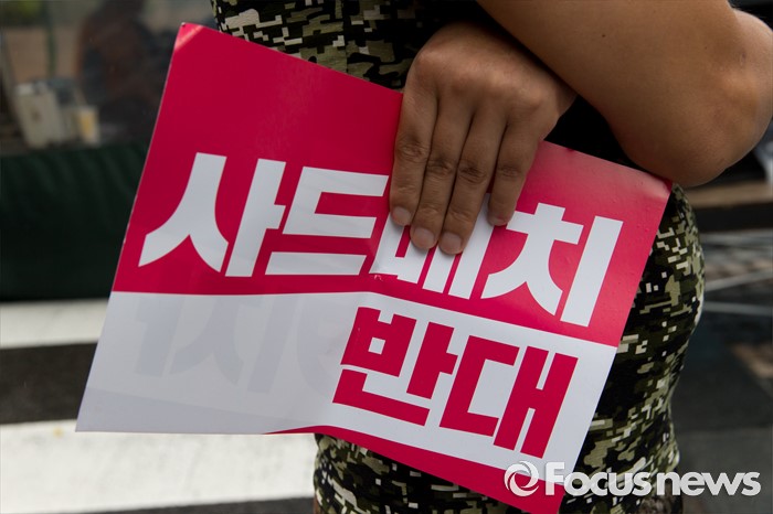 (서울=포커스뉴스) 16일 오후 서울 종로구 청계광장에서 사드한국배치반대전국대책회의 회원들이 사드 배치 결정 철회 평화행동을 하고 있다.
