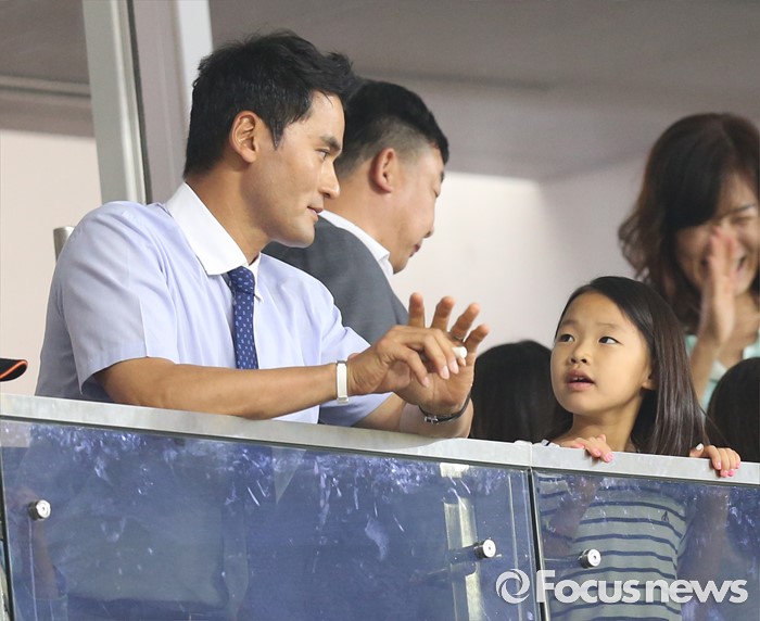(서울=포커스뉴스) 16일 서울 고척 스카이돔에서 열린 2016 프로야구 올스타 경기에서 박찬호가 딸과 함께 경기를 관전하고 있다.