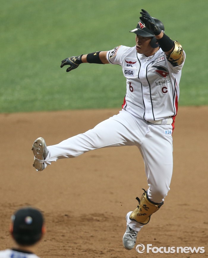 (서울=포커스뉴스) 16일 서울 고척 스카이돔에서 열린 2016 프로야구 올스타 경기 7회말 1사후 드림팀 박경수가 좌월 솔로 홈런을 치고 베이스를 돌며 발차기를 하며 3루로 들어가고 있다.