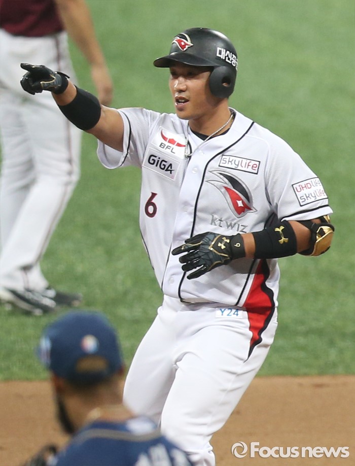 (서울=포커스뉴스) 16일 서울 고척 스카이돔에서 열린 2016 프로야구 올스타 경기 5회말 1사 2루에서 드림팀 대타 박경수가 우중간 2루타를 쳐 2루주자를 불러 들이고 2루에서 환호하고 있다.