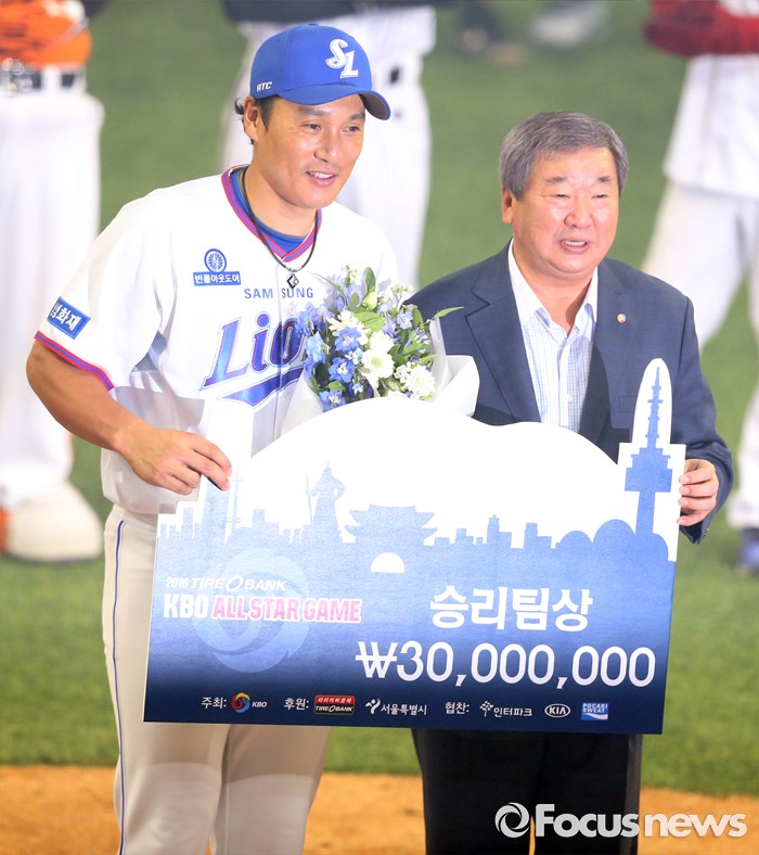 이승엽은 1995년 데뷔한 이후 올시즌까지 KBO 정규시즌 통산 431홈런을 쳐낸 한국프로야구 최다 홈런 기록 보유자다. 올시즌에도 이승엽은 타율 2할9푼 314타수 91안타(15홈런)으로 꾸준히 좋았다. 2016 KBO 올스타전은 정규 시즌에서 쉽사리 볼 수 없는 홈런왕의 번트출루를 선보이며 성황리에 막을 내렸다.(서울=포커스뉴스) 16일 서울 고척 스카이돔에서 열린 2016 프로야구 올스타전에서 승리팀인 드림팀 주장 이승엽이 구본능 KBO 총재와 기념사진을 찍고 있다.2016.07.16 우정식 기자 (서울=포커스뉴스) 16일 서울 고척 스카이돔에서 열린 2016 프로야구 올스타 경기 선수 소개에서 드림팀의 이승엽이 어린이와 함꼐 입장하고 있다. 2016.07.16 우정식 기자 (서울=포커스뉴스) 지난 6월7일 서울 잠실구장에서 열린 2016 프로야구 삼성-LG 경기 8회초 2사 1,2루에서 삼성 이승엽이 우월 3점 홈런을 치고 3루를 돌면서 김재걸 코치의 환영을 받고 있다. 2016.06.07 우정식 기자