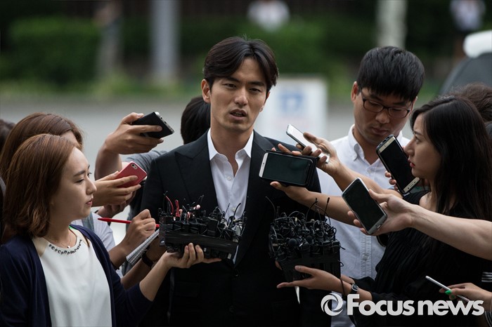 (서울=포커스뉴스) 성폭행 혐의로 피소된 배우 이진욱이 17일 오후 서울 강남구 수서경찰서에서 출석 전 취재진의 질문을 받고 있다.