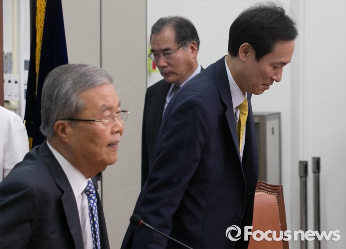 (서울=포커스뉴스) 18일 오전 서울 여의도 국회에서 열린 더불어민주당 비상대책위원회의에 김종인 비대위 대표, 우상호 원내대표가 참석하고 있다.
