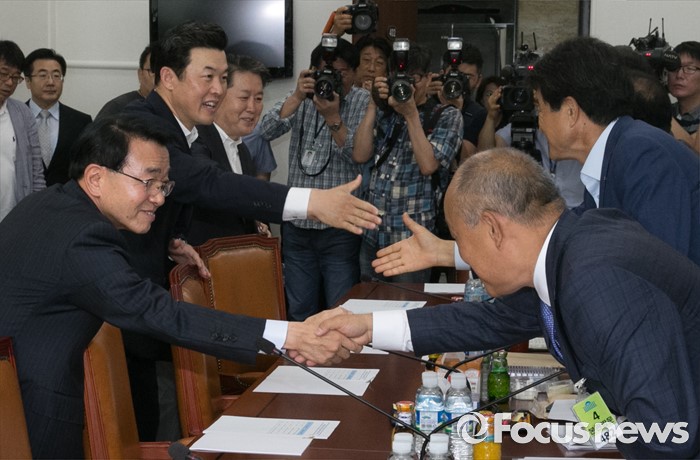 (서울=포커스뉴스) 18일 오전 서울 여의도 국회에서 열린 외교통일위원장 및 3당 간사단과 통일부, 개성공단 기업협의회 임원진 긴급간담회에 참석한 심재권(왼쪽부터) 외통위원장, 윤영석 새누리당 간사, 김경협 더불어민주당 간사가 임원진과 인사하고 있다.