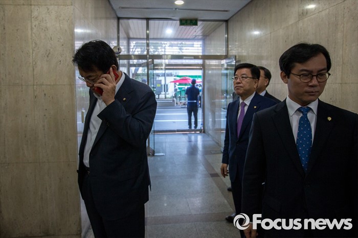 (서울=포커스뉴스) 정진석(왼쪽) 새누리당 원내대표와 박명재 사무총장이 18일 오전 서울 여의도 새누리당사에서 열린 혁신비상대책위원회의에 참서하기 위해 이동하며 전화통화 하고 있다.