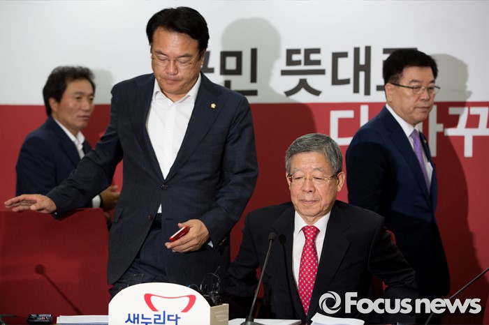 (서울=포커스뉴스) 김희옥(오른쪽 두 번째) 새누리당 혁신비상대책위원장과 정진석(왼쪽 두 번째) 원내대표가 18일 오전 서울 여의도 새누리당사에서 열린 혁신비상대책위원회의에 참석 하기 위해 회의실로 들어서고 있다.