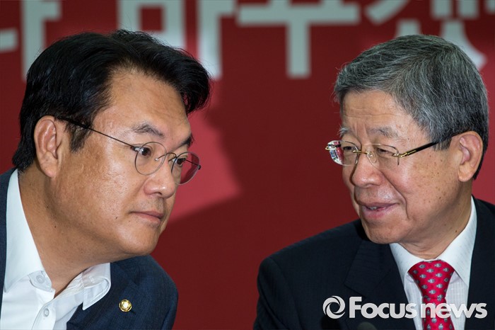 (서울=포커스뉴스) 김희옥(오른쪽) 새누리당 혁신비상대책위원장과 정진석 원내대표가 18일 오전 서울 여의도 새누리당사에서 열린 혁신비상대책위원회의에 참석해 대화 하고 있다.