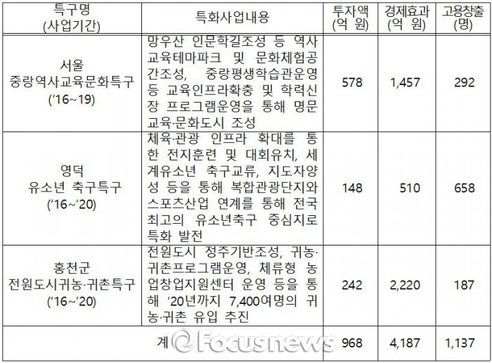 이번에 신규로 지정된 지역특구는 서울 중랑역사교육문화특구, 경북 영덕 유소년축구특구, 강원 홍천 전원도시귀농·귀촌특구 등이다.