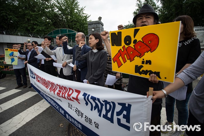 (서울=포커스뉴스) 한국 기독교교회협의회 관계자들이 18일 오전 서울 용산구 국방부 앞에서 사드 배치 반대 기자회견을 하고 있다.