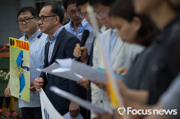 (서울=포커스뉴스) 한국 기독교교회협의회 관계자들이 18일 오전 서울 용산구 국방부 앞에서 사드 배치 반대 기자회견을 하고 있다.