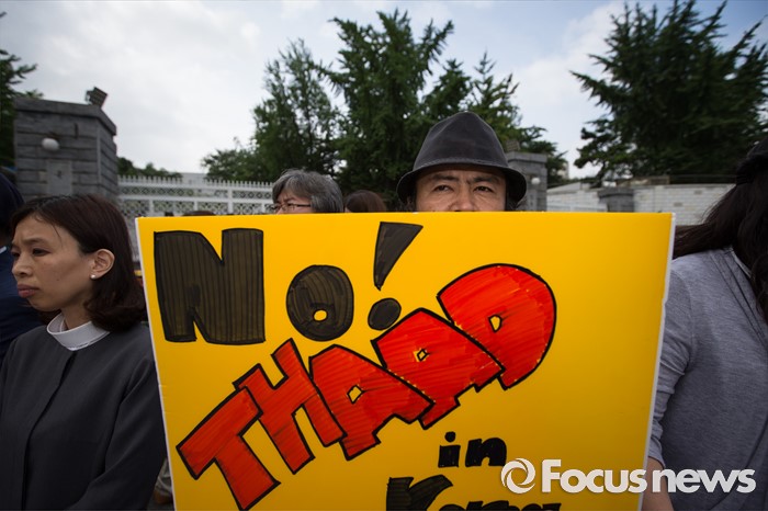 (서울=포커스뉴스) 한국 기독교교회협의회 관계자들이 18일 오전 서울 용산구 국방부 앞에서 사드 배치 반대 기자회견을 하고 있다.