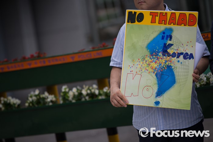 (서울=포커스뉴스) 한국 기독교교회협의회 관계자들이 18일 오전 서울 용산구 국방부 앞에서 사드 배치 반대 기자회견을 하고 있다.
