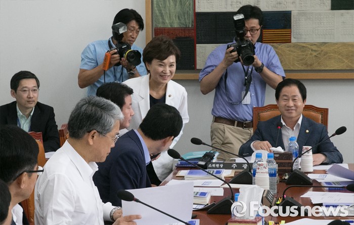 (서울=포커스뉴스) 18일 오전 서울 여의도 국회에서 열린 예산결산특별위원회 결산심사소위원회에 참석한 김현미(가운데) 예결위원장이 격려 방문해 인사하고 있다. 오른쪽은 주광덕 소위원장.