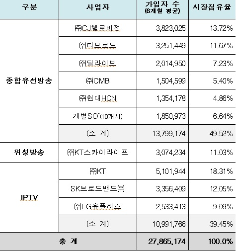 미래창조과학부에 따르면 지난해 하반기 국내 유료방송 가입자 수는 총 2786만5174명(6개월 평균)으로 IPTV 가입자가 1099만명까지 증가하며 케이블TV 1380만명과 격차를 줄였다. 여기에 KT가 가지고 있는 위성방송을 고려한다면 IPTV진영(IPTV+위성방송)의 점유율은 50.6%로 이미 케이블TV 49.4%를 넘어선 상태다.