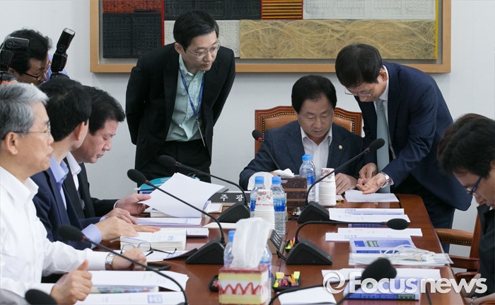 (서울=포커스뉴스) 18일 오전 서울 여의도 국회에서 열린 예산결산특별위원회 결산심사소위원회에 참석한 주광덕 소위원장이 수석전문위원 등과 대화하고 있다.