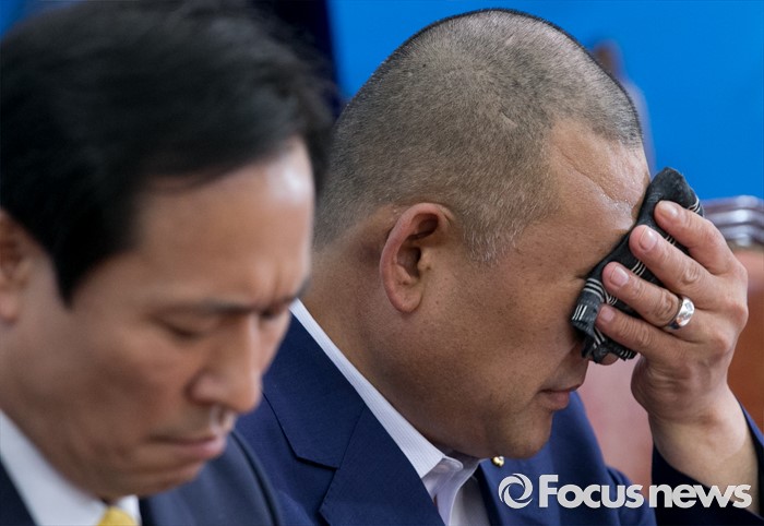 (서울=포커스뉴스) 18일 오전 서울 여의도 국회에서 열린 우상호 더불어민주당 원내대표와 사드반대 전국대책회의 등 관련단체 면담에 참석한 노광희(오른쪽) 성주군의회 의원이 땀을 닦고 있다.