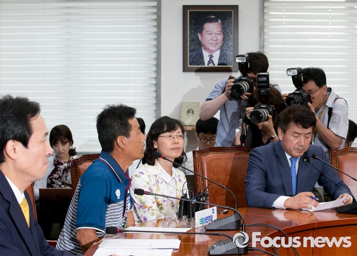 (서울=포커스뉴스) 18일 오전 서울 여의도 국회에서 열린 우상호 더불어민주당 원내대표와 사드반대 전국대책회의 등 관련단체 면담에 참석한 이재동(왼쪽 두번째) 성주군 농민회장이 발언하고 있다.