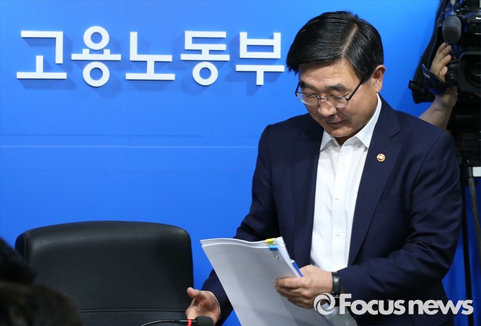 (세종=포커스뉴스) 이기권 고용노동부장관이 18일 오전 세종시 정부세종청사 고용노동부 기자실에서 2016년 하반기 고용노동정책 방향에 대한 브리핑을 하기 위해 입장하고 있다.