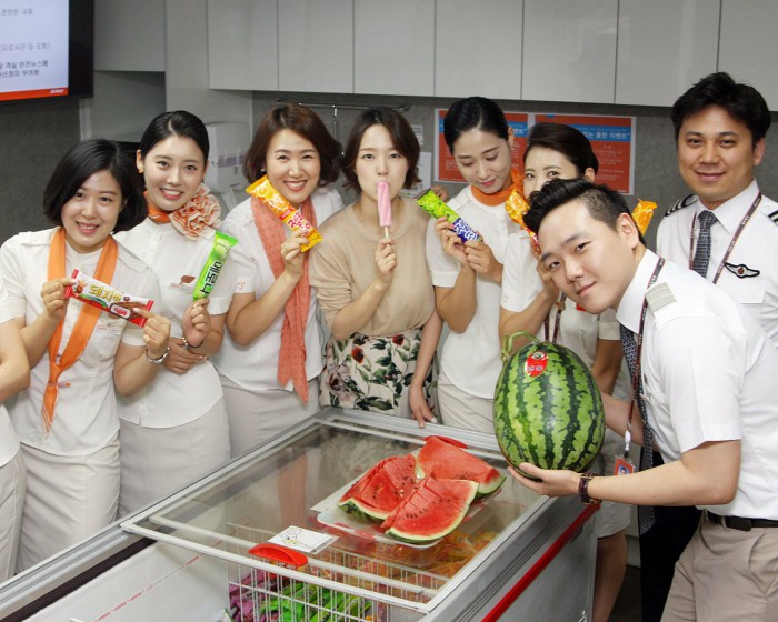 제주항공은 여름철 성수기 특별수송기간을 맞아 18일 전 임직원을 대상으로 수박파티를 열었다. 또 회사에 대형 아이스크림 냉장고를 들여놓고 전 직원에게 7~8월간 무제한으로 아이스크림을 제공한다. 본사에서 근무하지 않는 현장직원에게는 이에 해당하는 특별예산을 배정했다.