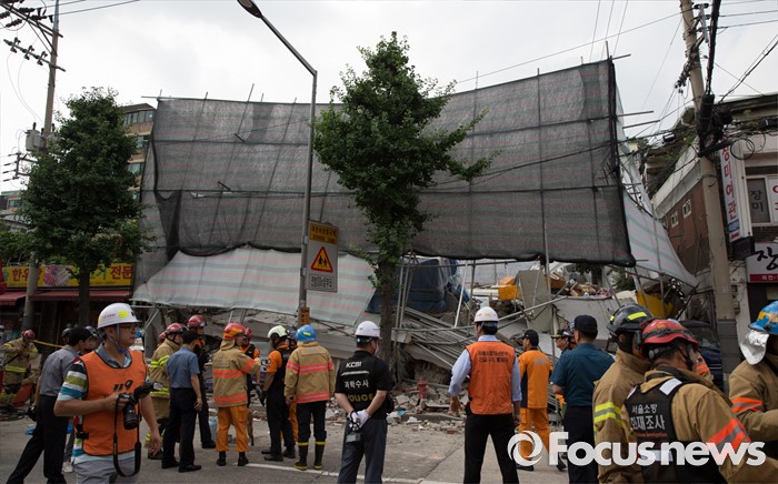 (서울=포커스뉴스) 18일 오후 서울 서대문구 홍은동 한 공사장에서 붕괴사고가 일어나 소방대원들이 구조작업을 벌이고 있다. 소방당국은 붕괴된 건물에 현재 1명이 매몰되어 있다고 밝혔다.