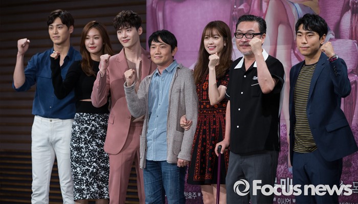 (서울=포커스뉴스) 18일 오후 서울 마포구 MBC 상암사옥에서 열린 MBC 수목미니시리즈 'W' 제작발표회에 참석한 배우 이태환(왼쪽부터), 정유진, 이종석, 정대윤 감독, 한효주, 김의성, 이시언이 포토타임을 갖고 있다.