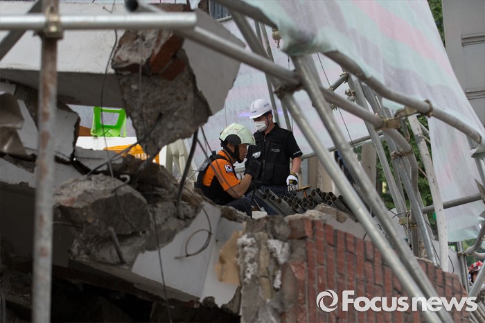 (서울=포커스뉴스) 18일 오후 서울 서대문구 홍은동 한 공사장에서 붕괴사고가 일어나 소방대원들이 구조작업을 벌이고 있다. 소방당국은 붕괴된 건물에 현재 1명이 매몰되어 있다고 밝혔다.