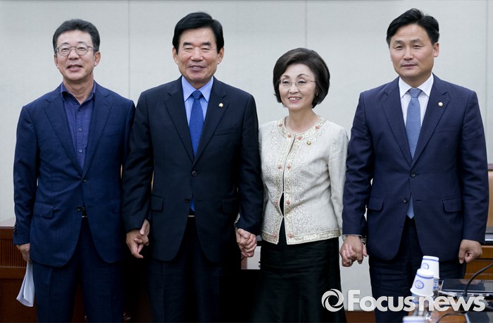 (서울=포커스뉴스) 18일 오후 서울 여의도 국회에서 열린 지방재정·분권 특별위원회 전체회의에 참석한 김진표 위원장과 3당 간사가 취재진을 향해 포즈를 취하고 있다. 왼쪽부터 홍철호 새누리당 간사, 김 위원장, 장정숙 국민의당 간사, 김영진 더불어민주당 간사.