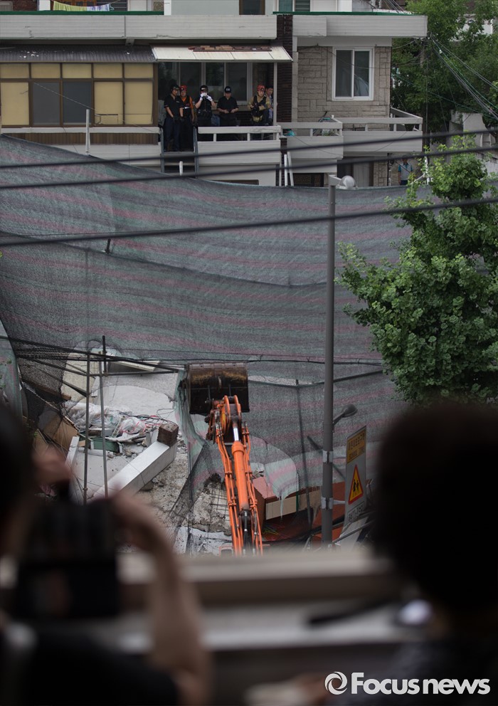 (서울=포커스뉴스) 서울 서대문구 홍은동 한 공사장에서 붕괴사고가 일어난 18일 오후 시민들이 사고현장을 바라보고 있다. 소방당국은 붕괴된 건물 지하에 1명이 매몰되어 있다고 밝혔다.
