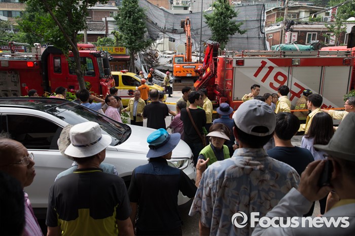 (서울=포커스뉴스) 서울 서대문구 홍은동 한 공사장에서 붕괴사고가 일어난 18일 오후 시민들이 사고현장을 바라보고 있다. 소방당국은 붕괴된 건물 지하에 1명이 매몰되어 있다고 밝혔다.
