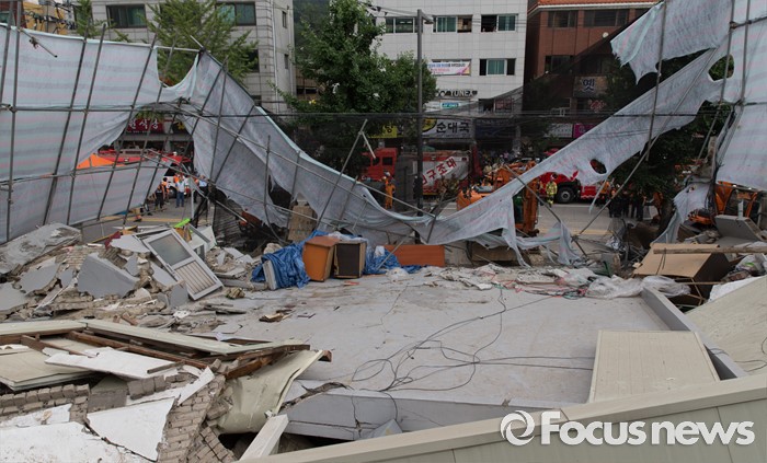 (서울=포커스뉴스) 18일 오후 서울 서대문구 홍은동 한 공사장에서 붕괴사고가 일어나 소방대원들이 구조작업을 벌이고 있다. 소방당국은 붕괴된 건물 지하에 1명이 매몰되어 있다고 밝혔다.